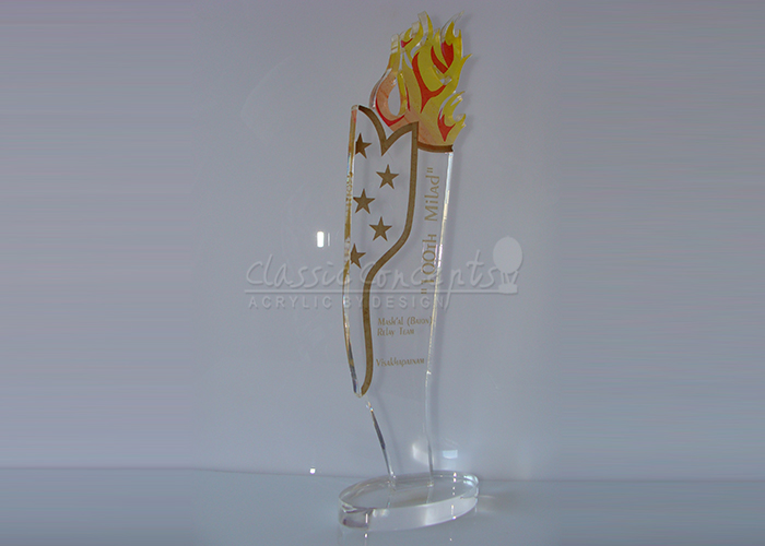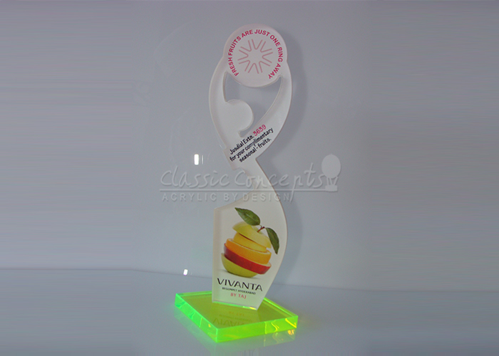Earlier, winners of events used to receive a trophy, cup, or medal along with a certificate. With acrylic recognition awards, there is no necessity for certificates as the mementos themselves contain the awardee details, authorizing signature, event details, logo, etc. Such minimal yet personally curated acrylic plaques are top trending awards mementos today. With a color background lamination, the text and logos become more visible. Moreover, it is also possible to give a textured finish to the acrylic mementos. You think that mementos are made of wood and text engraved on it. But it would be made of acrylic plastic. We can incorporate LED light strips along the outline or in parts of the printed text (on large trophies). This lighting helps to illuminate the names of the winners or achievers. Moving on from 2D shapes, many prefer 3D personalized acrylic mementos for gifting. One example of transparent memorabilia is the acrylic prism that contains 3D images of a person with a message that acts as the perfect gift for an occasion.